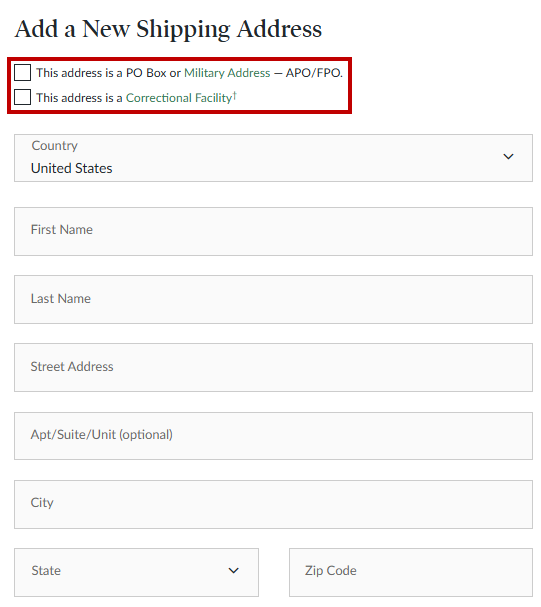 When entering the shipping address either in your account or on the order, check the box at the top of the Address form that states: "This address is a Correctional Facility" to ensure that the order is delivered via USPS, as that is the only carrier that most facilities allow for deliveries.